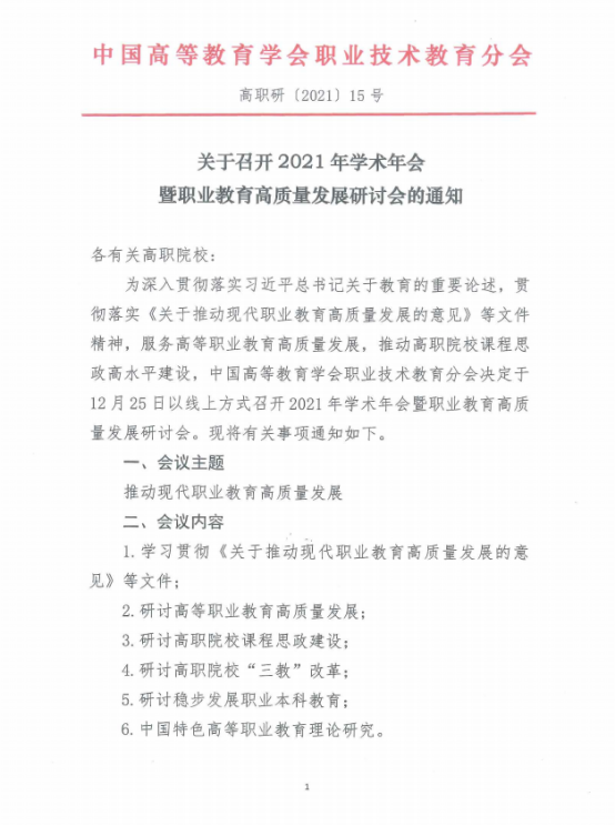 现接到由中国高等教育学会职业教育技术分会于12月25日(周六)以线上方式召开2021年学术年会暨职业教育高质量发展研讨会的通知,请老师们积极参加!