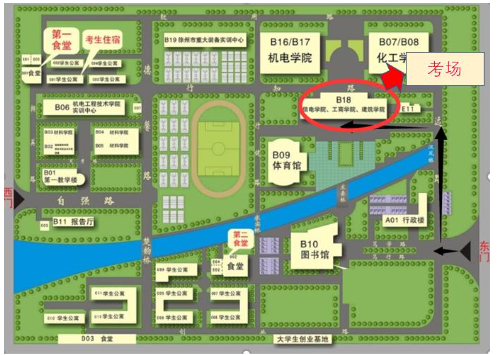 2.进校路线:考生统一从东门进入学校,进校后沿致远路、行知路前往B18楼考场。进校后在专门人员的引导下有序进入考场,详细路线规划见附件1。