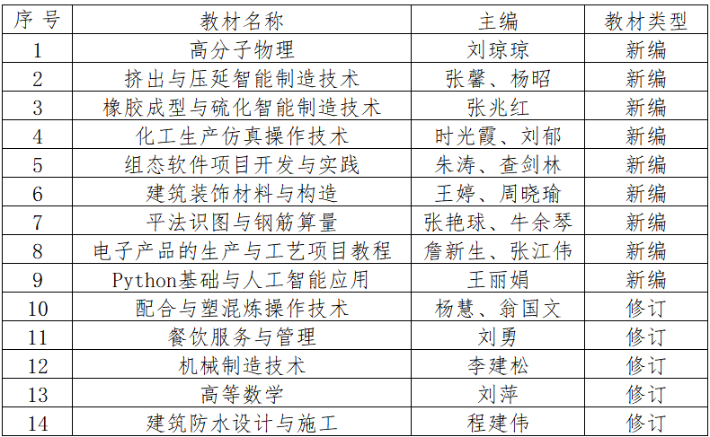 各学院(部): 按照关于开展2022年度校级规划教材立项与建设工作的通知(教务通知[2022]第2号),依据《徐州工业职业技术学院规划教材建设管理办法(试行)》(徐工职院发〔2021〕187号)相关规定和工作要求,经教师自主申报、教学单位审核推荐、校外专家评审、校教学委员会审议等环节,现将拟立项建设规划教材公示如下: