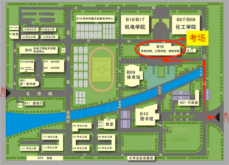 (2)进校路线:考生统一从东门进入学校,进校后沿志远路、行知路前往B18楼6楼、9楼考场。详细路线规划见附件2。