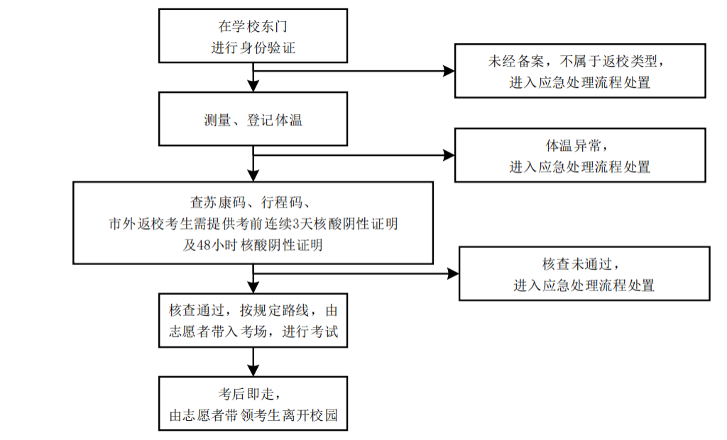 坚决贯彻落实江苏省教育厅的有关要求,全力以赴做好校外考生返校考试的疫情防控工作,做好健康排查,确保学校全体师生的生命安全和身体健康,确保校园安全稳定。