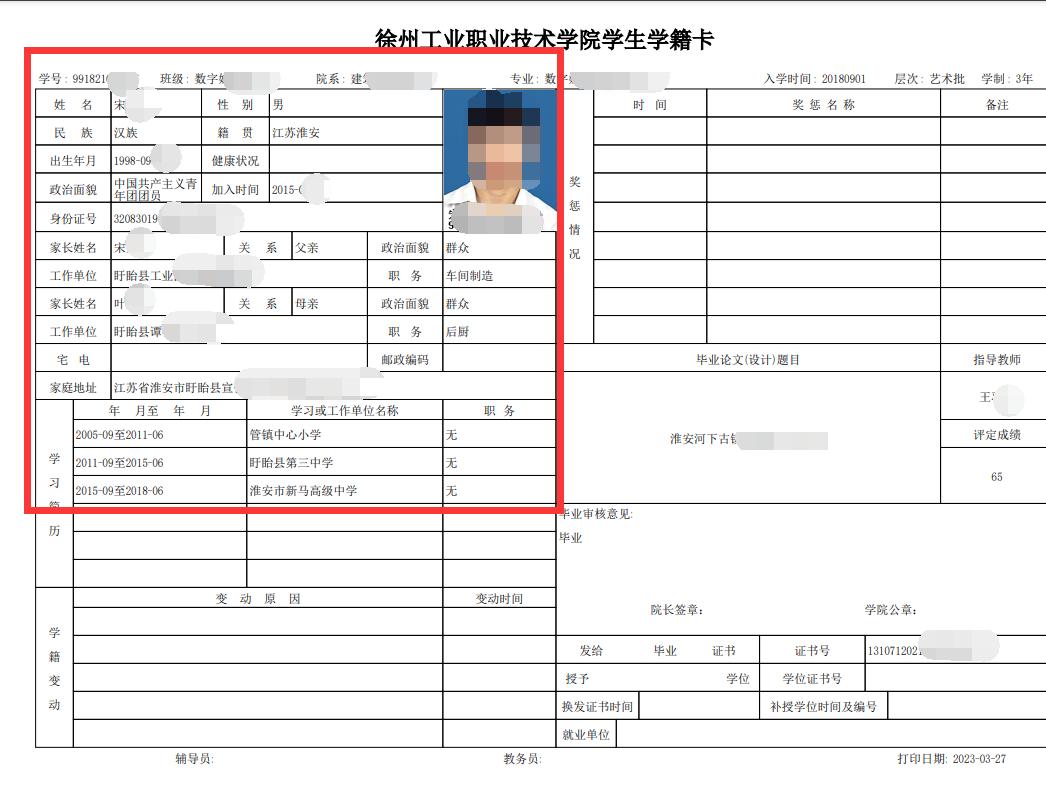 根据《普通高等学校学生管理规定》(中华人民共和国教育部令第41号)《高等学校学生学籍学历电子注册办法》(教学〔2014〕11号)、《省教育厅办公室关于做好 2023 年普通高校新生入学资格复查和学籍电子注册工作的通知》(苏教办学函〔2023〕17 号)以及《徐州工业职业技术学院学生学籍管理规定》(徐工职院发〔2017〕128号)等文件精神,我校2023级学生学籍电子注册工作已基本完成。为保证中国高等教育学生信息网(以下简称“学信网”)上学生学籍信息的准确性和我校教学管理平台学生学籍卡信息完整性,现开展2023级学生学信网信息自查及全校在籍学生学籍卡信息完善工作,有关事宜通知如下:
