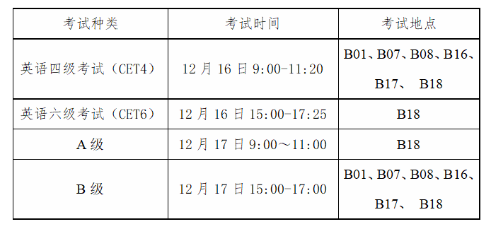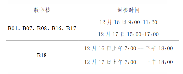 根据江苏省教育考试院文件安排,2023年12月全国大学英语等级考试将于12月16-17日两天举行。为确保考试正常进行,保证考试环境不受干扰,根据国家级考试要求,学校将在考试期间对相关教学楼进行封楼管理。现将相关事项通知如下: