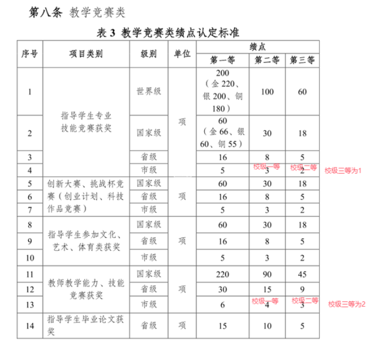 上表标红的校级一等、校级二等、校级三等,“类似江苏省高教学会主办的,降为校级的奖励”,教学竞赛类我校举办的校级奖励无绩点。