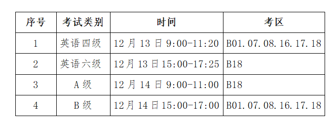 现将2025年12月13、14日举行的全国大学英语四、六级和A、B级考试考生考前准备工作通知如下: